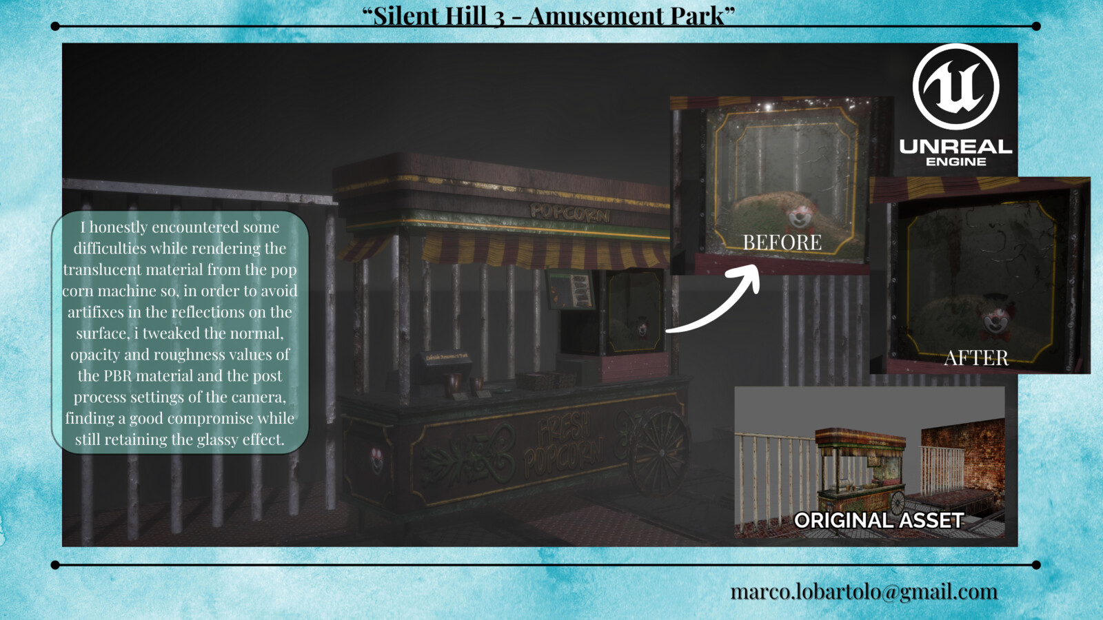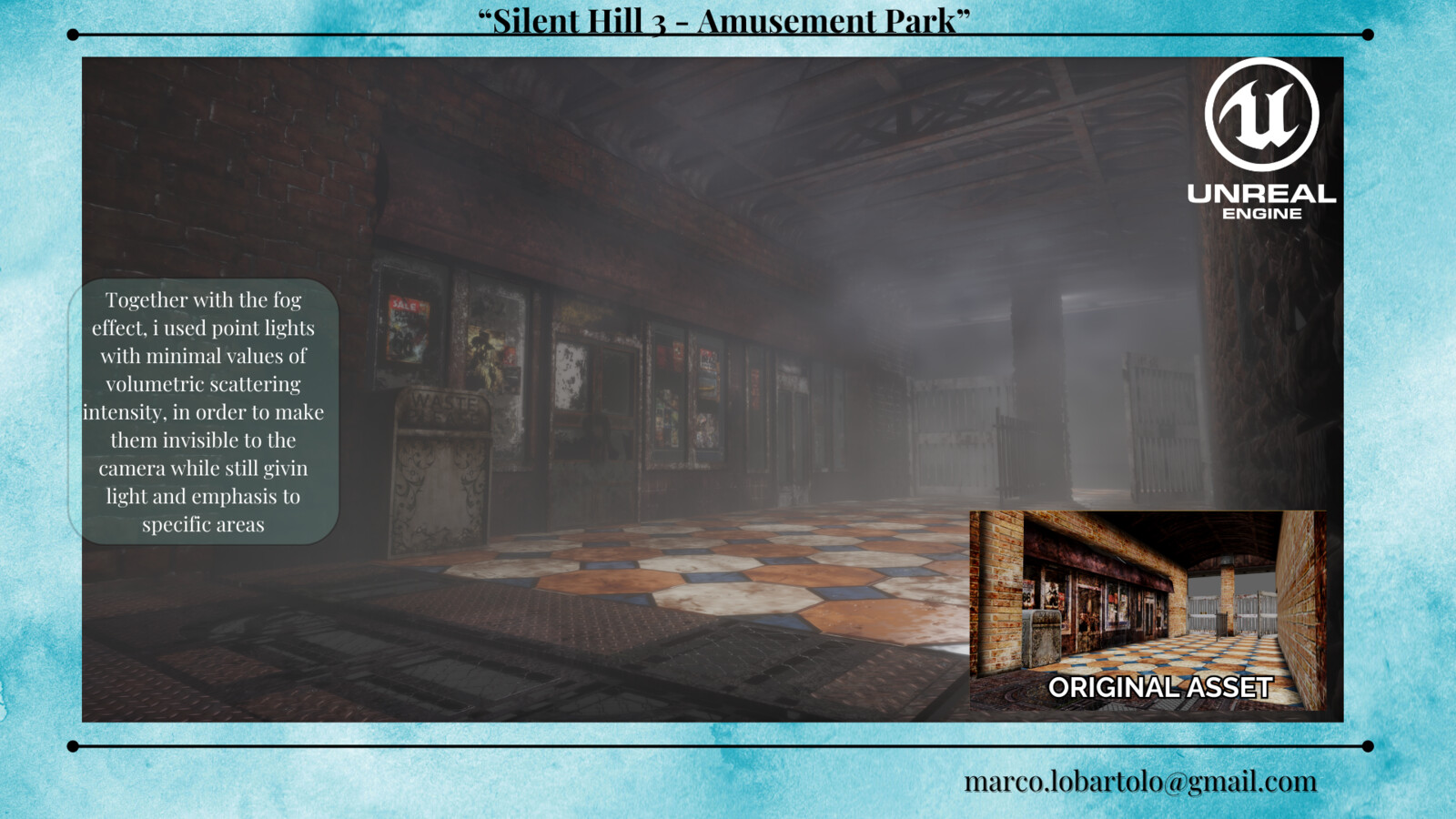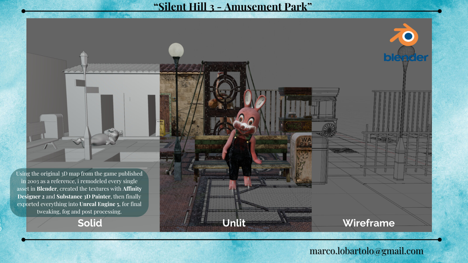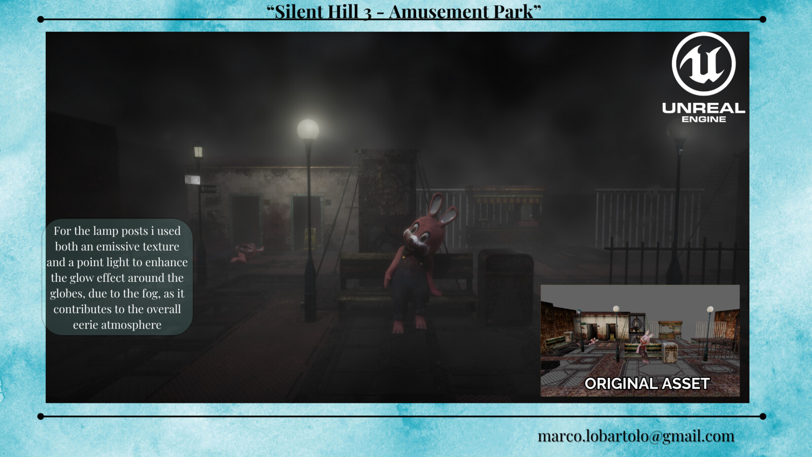 Here is my last portfolio piece based on the Lakeside Amusement Park entrance, a setting which is part of Silent Hill 3 game from 2003 developed by Team Silent.